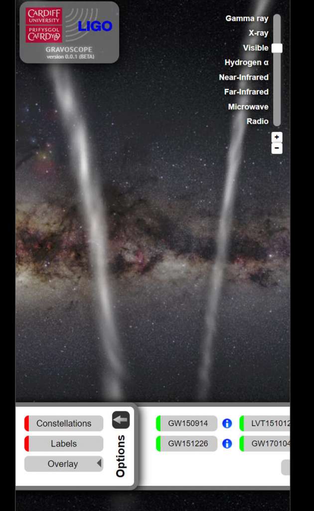 Gravoscope combines two distinct views of the Universe. You can explore our Galaxy (the Milky Way) and the distant Universe in a range of wavelengths from gamma-rays to the longest radio waves. Change the wavelength using the slider in the top right of the screen and explore space using your mouse. Gravoscope also allows you to overlay the projected possible locations of gravitational waves detected by Advanced LIGO. Cardiff University.